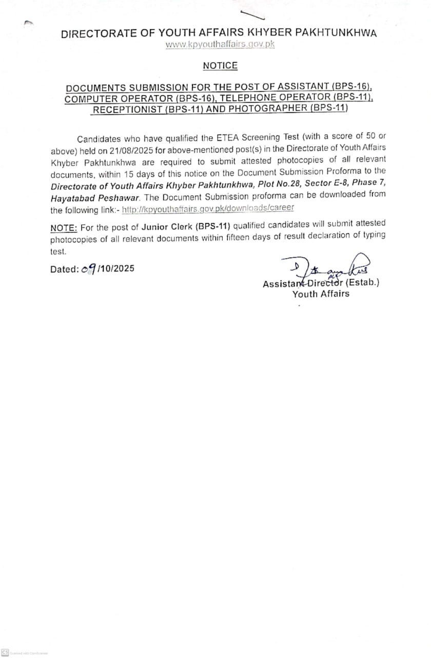 All candidates who have passed the ETEA test for various posts in the Directorate of Youth Affairs are requested to submit their documents within fifteen days